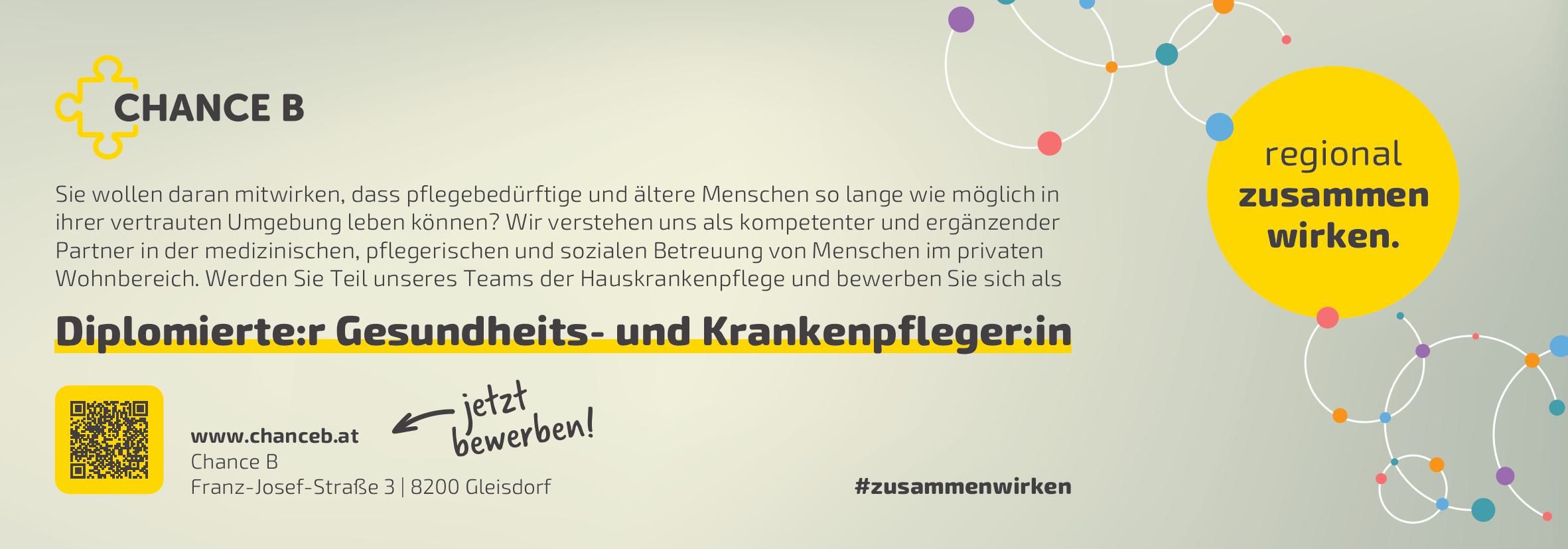 Sie wollen daran mitwirken, dass pflegebedürftige und ältere Menschen so lange wie möglich in ihrer vertrauten Umgebung leben können? Wir verstehen uns als kompetenter und ergänzender Partner in der medizinischen, pflegerischen und sozialen Betreuung von Menschen im privaten Wohnbereich. Werden Sie Teil unseres Teams der Hauskrankenpflege und bewerben Sie sich jetzt: Chance B, 8200 Gleisdorf, Franz-Josef-Straße 3