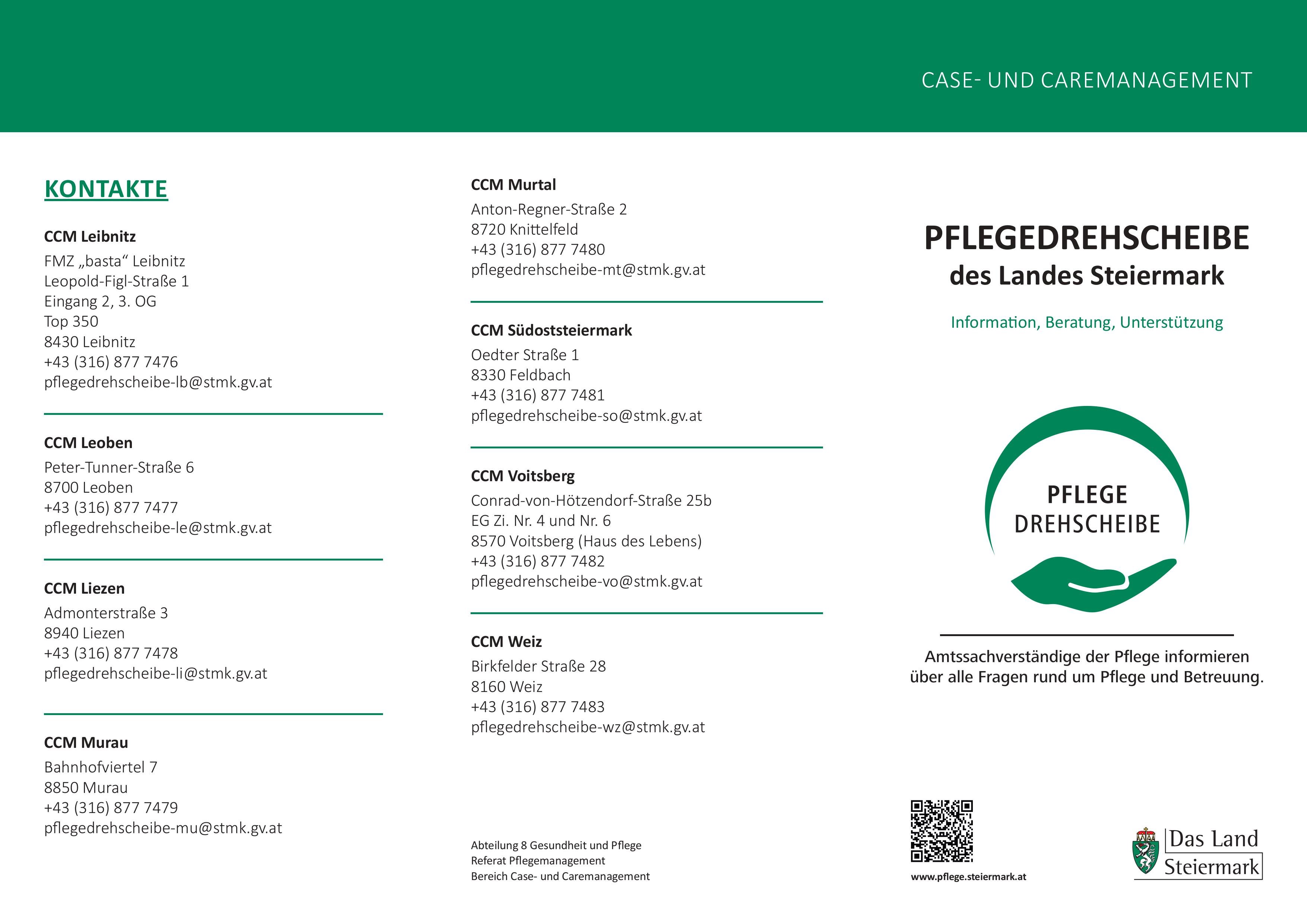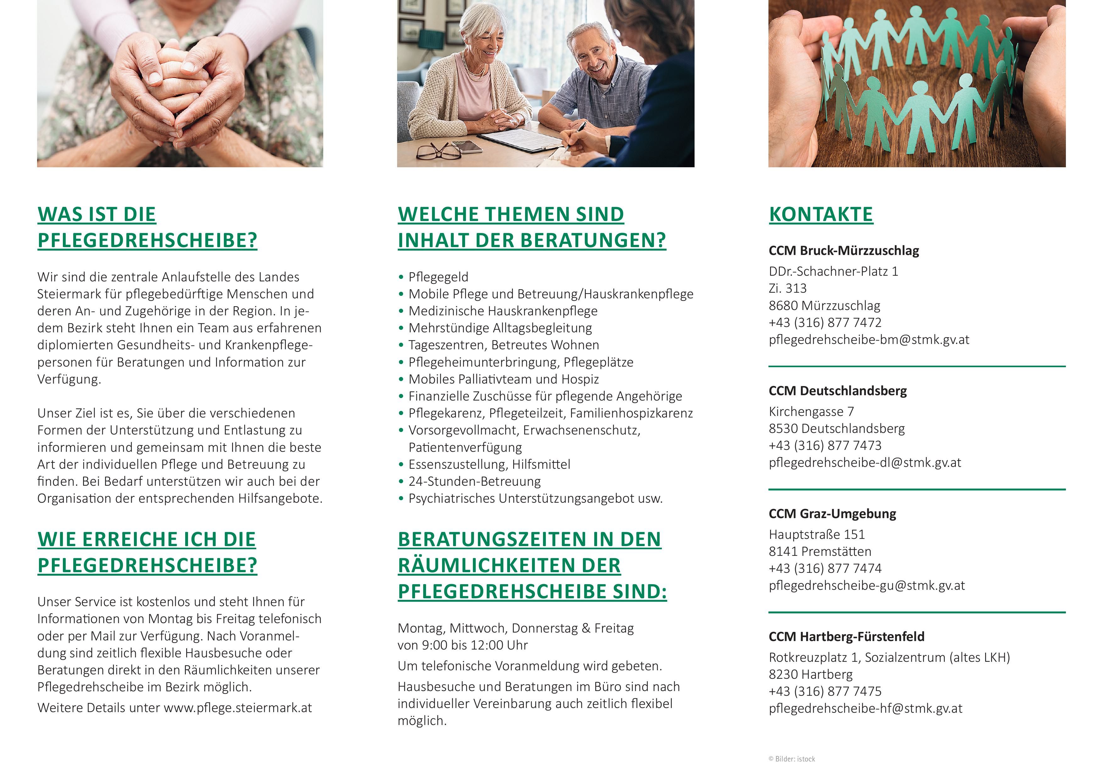 Die Pflegedrehscheiben des Landes Steiermark sind regionale, zentrale Beratungs- und Servicestellen für Menschen mit Pflege- und Unterstützungsbedarf sowie für deren Angehörige. Sie bieten Orientierung im vielfältigen Pflege- und Betreuungssystem und unterstützen dabei, passende Lösungen für die jeweilige Lebenssituation zu finden.
